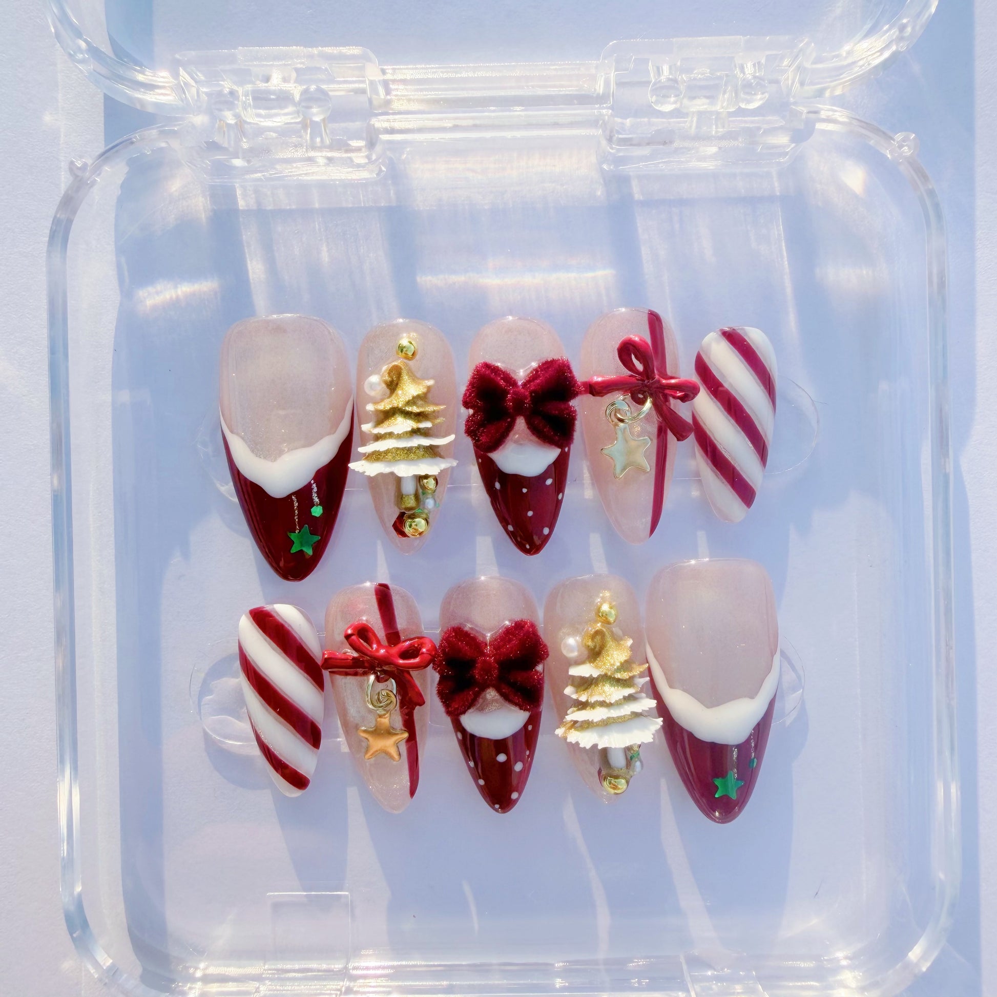 Bring the magic of the holidays to your fingertips with these luxury Christmas press-on nails. Featuring deep red French tips, shimmering golden Christmas tree charms, fluffy velvet bows, and candy-cane stripes, this set combines festive fun with elegant craftsmanship.