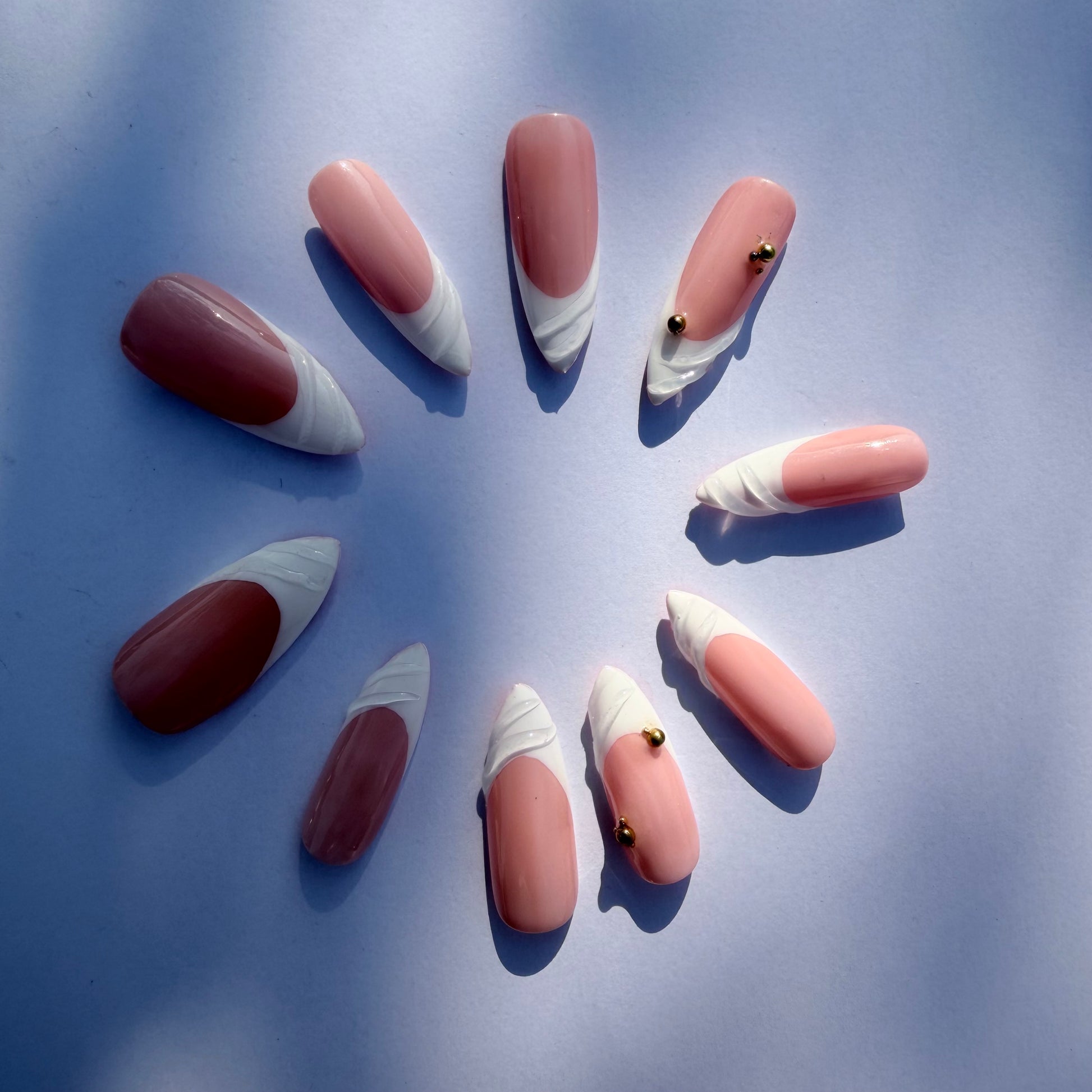 Featuring a natural nude-pink base paired with 3D carved white swirl tips and subtle gold bead accents, this set adds dimension and sophistication without being overly flashy.