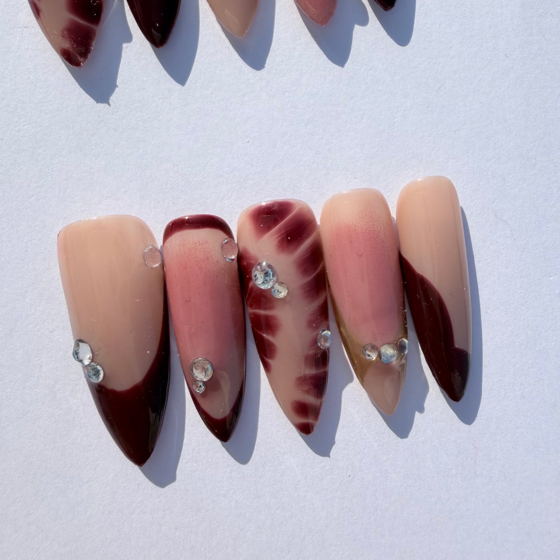 Elegant burgundy gradient press-on nails featuring starburst art, marble details, and sparkling rhinestones. A chic mix of deep wine tones and nude shades for a classy, eye-catching manicure without the salon time.