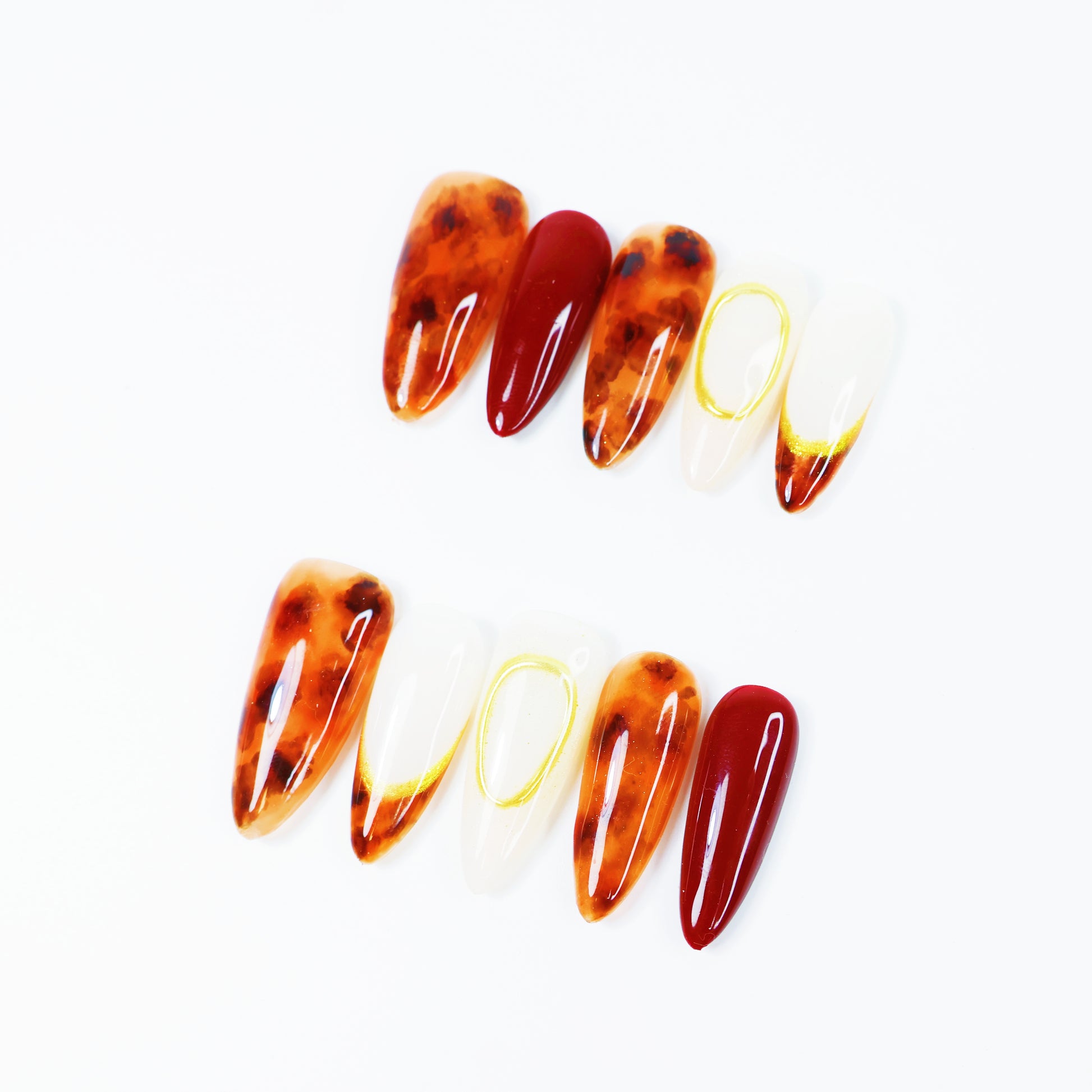 These Amber Marble & Wine Red Press-On Nails blend rich autumn hues with luxurious gold accents for a chic, polished look. The warm tortoiseshell amber pattern pairs beautifully with glossy wine red and minimalist gold outlines — creating the perfect balance of sophistication and trend.