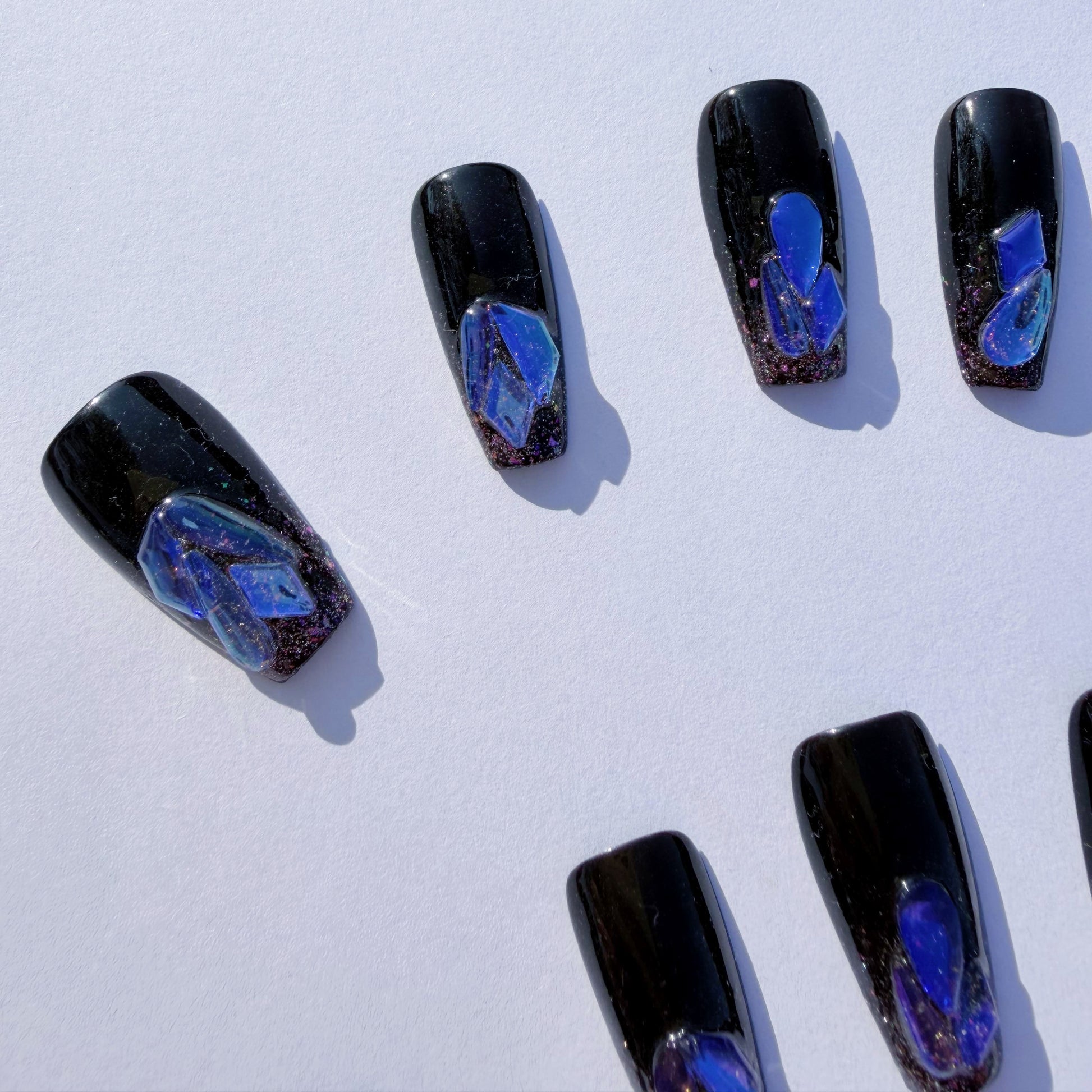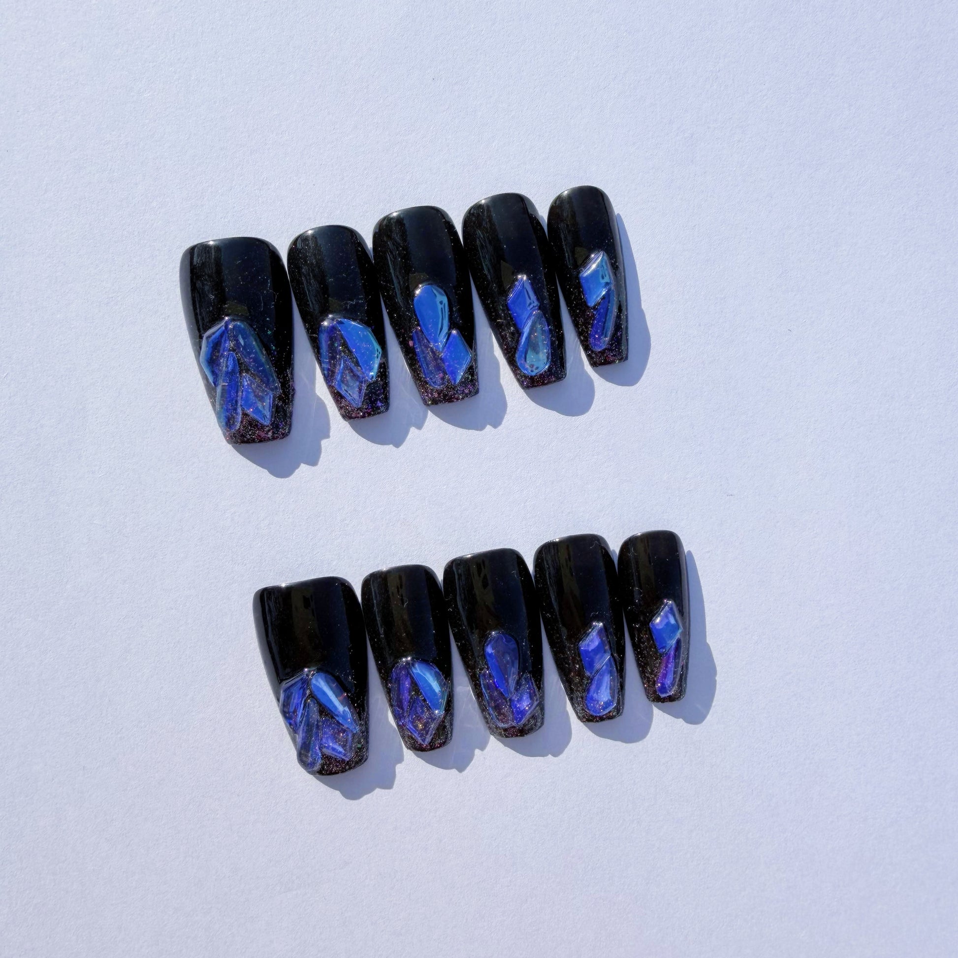 Designed for the sophisticated woman with an affinity for high art and dark romance, this collection transforms your manicure into a wearable masterpiece. Each nail features a deep, high-gloss black base illuminated by vibrant, swirling blue and purple "nebula" effects, mimicking the ethereal beauty of a distant galaxy. The short, elegant coffin shape maintains a refined silhouette, while the subtle shimmer at the tip adds a touch of celestial sparkle. This is a luxurious, artistic set that offers a unique blend of natural cosmic wonder and glamorous, avant-garde style.