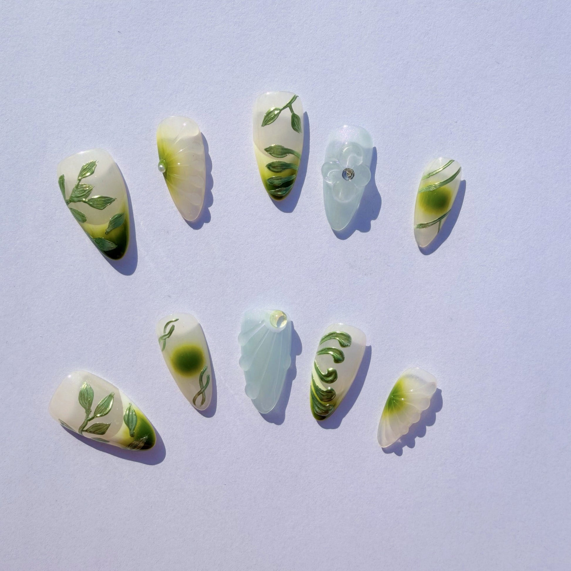 Luxury Press-On Nails | Green Botanical 3D Sculpture & Lavender Ombre | Reusable, Long Almond Shape