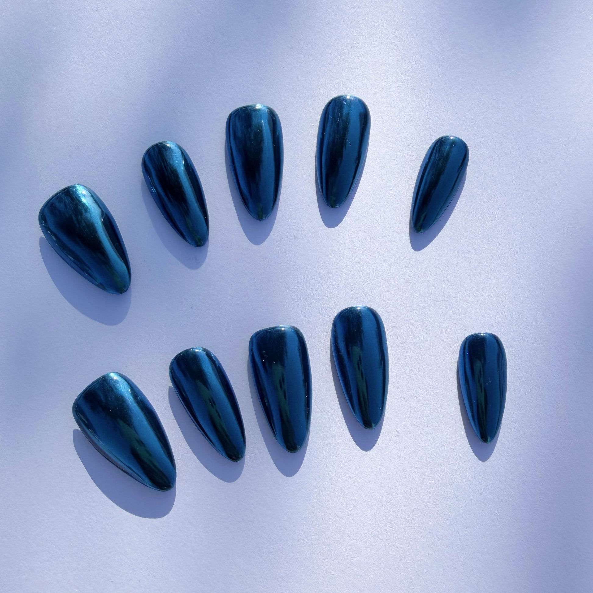 Luxury Press-On Nails | Deep Sapphire Blue Mirror Chrome Finish | Reusable, Medium Stiletto Shape