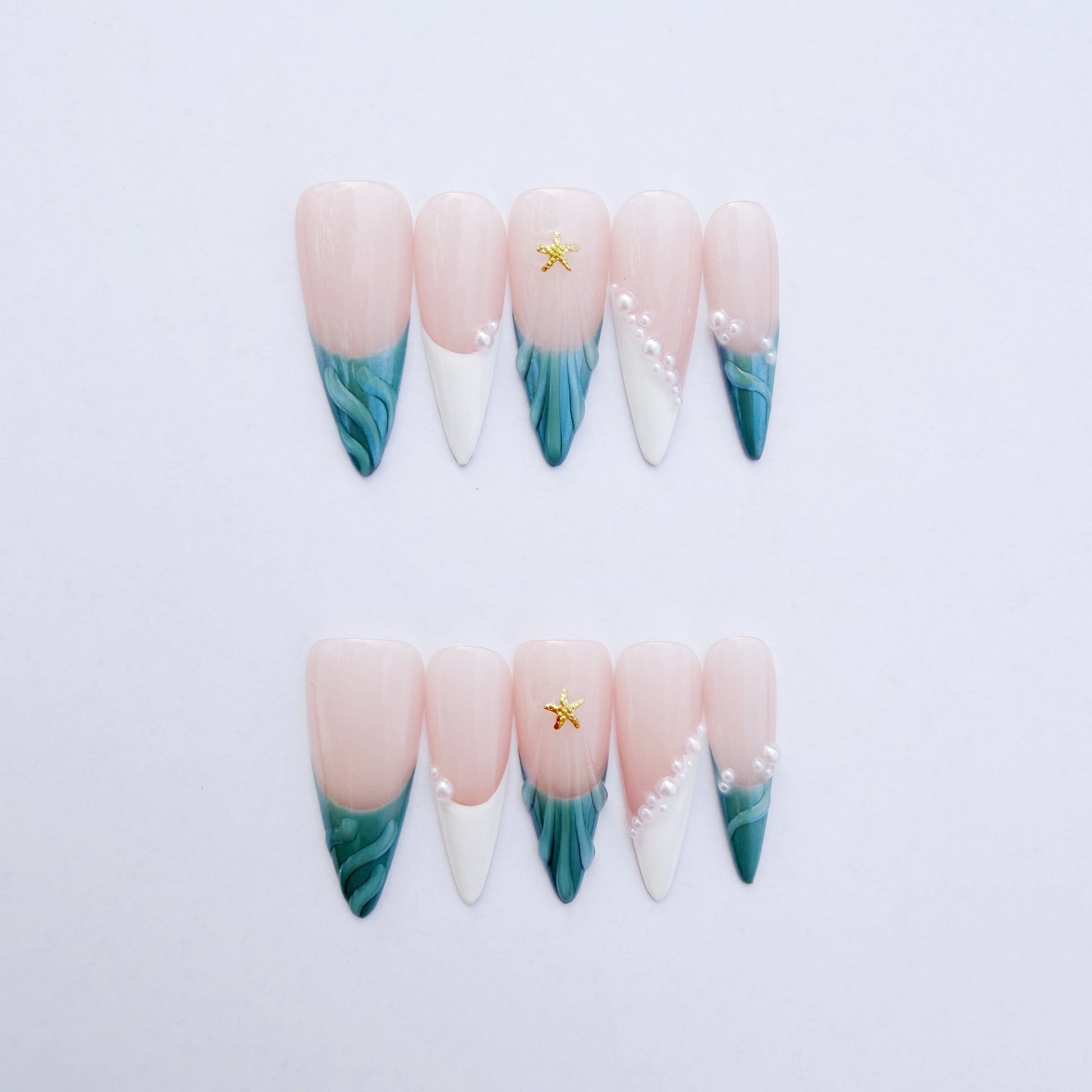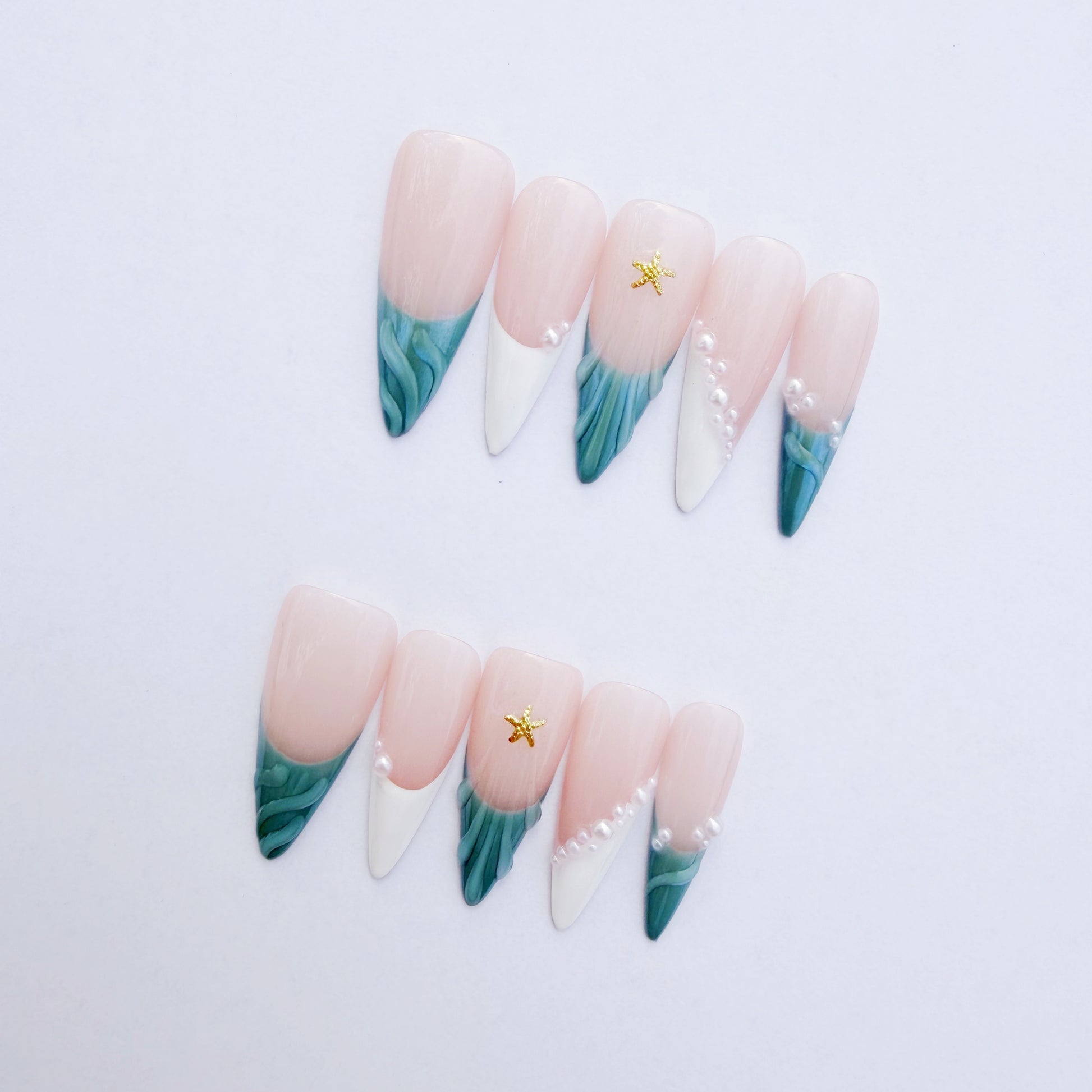 The design features a classic nude French tip base that gracefully transitions into two mesmerizing styles: a crisp white tip accented with delicate pearl clusters and a stunning iridescent, wave-like turquoise-green tip. The centerpiece is a subtle gold starfish charm, adding a touch of exclusive Mermaidcore luxury. The varying textures—from the smooth nude base to the shimmering tips and luminous pearls—create a multi-dimensional, salon-quality look. Easy to apply and durable, this set delivers a glamorous, high-fashion manicure that is both unique and refined.