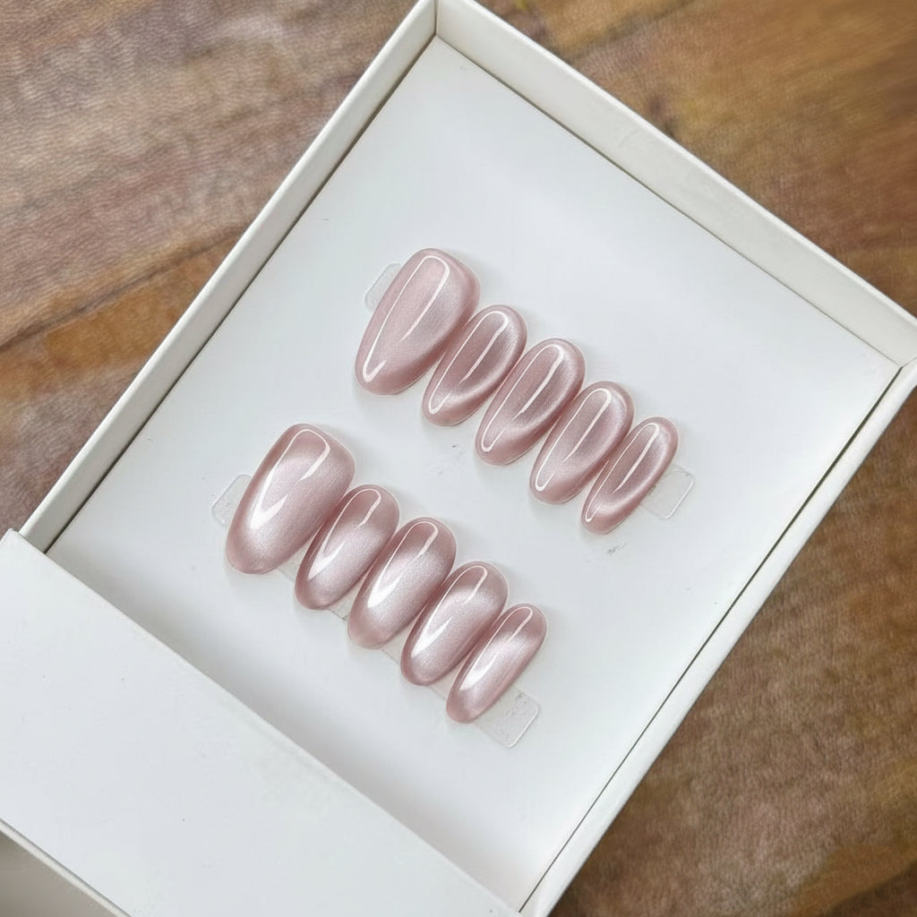 Luxury Press-On Nails | Pink Cat Eye Magnetic Polish | Reusable, Short Oval/Round Shape