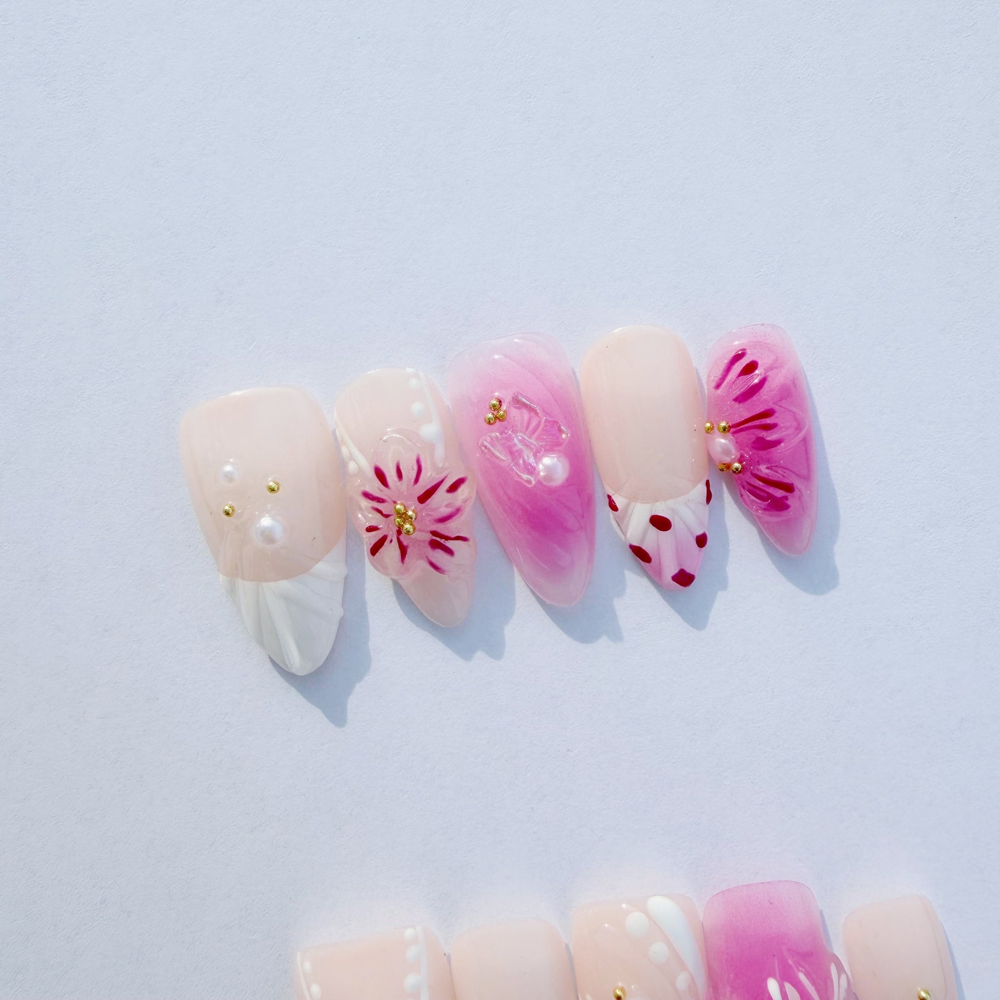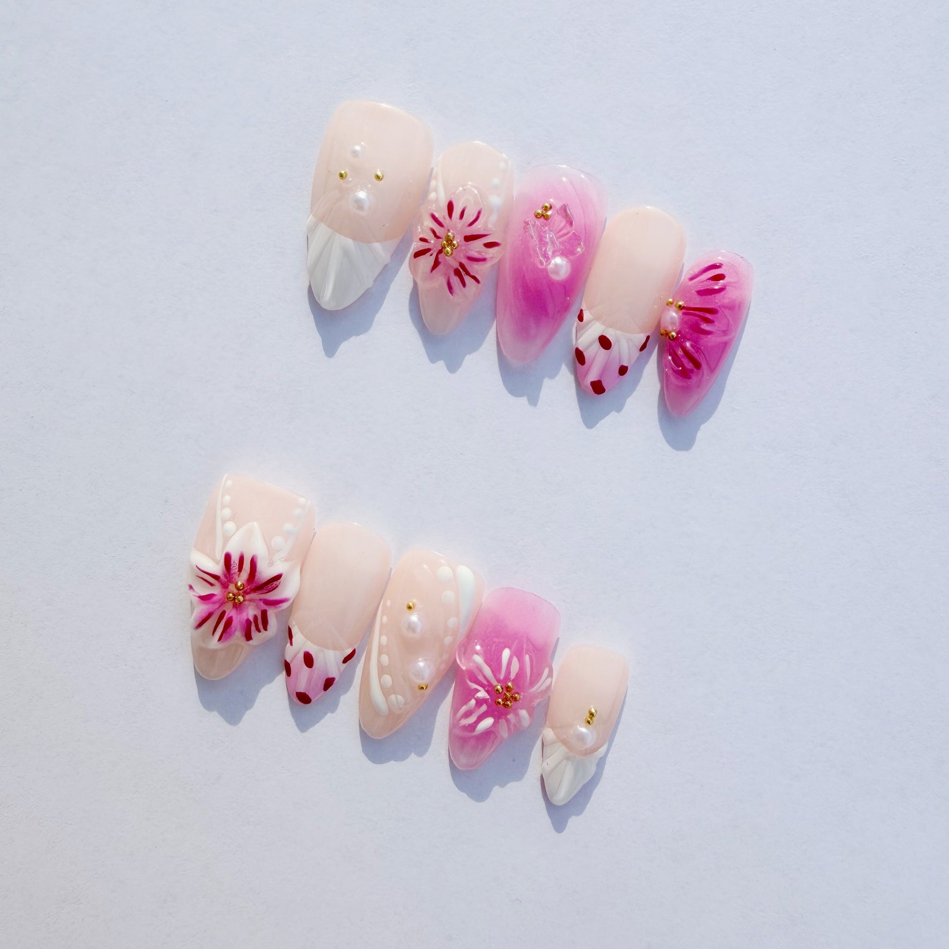 The set features a sophisticated blend of translucent nude bases and deep, rich cranberry pink ombre accents. The artistry is showcased through intricate, hand-sculpted 3D cherry blossoms, delicate white ribbon details, and luminous pearl and gold stud embellishments. This design marries the soft elegance of a French manicure with dramatic, romantic flair, creating a statement piece that is both refined and eye-catching. Effortlessly achieve a flawless, salon-quality look for any upscale event or a glamorous everyday style.