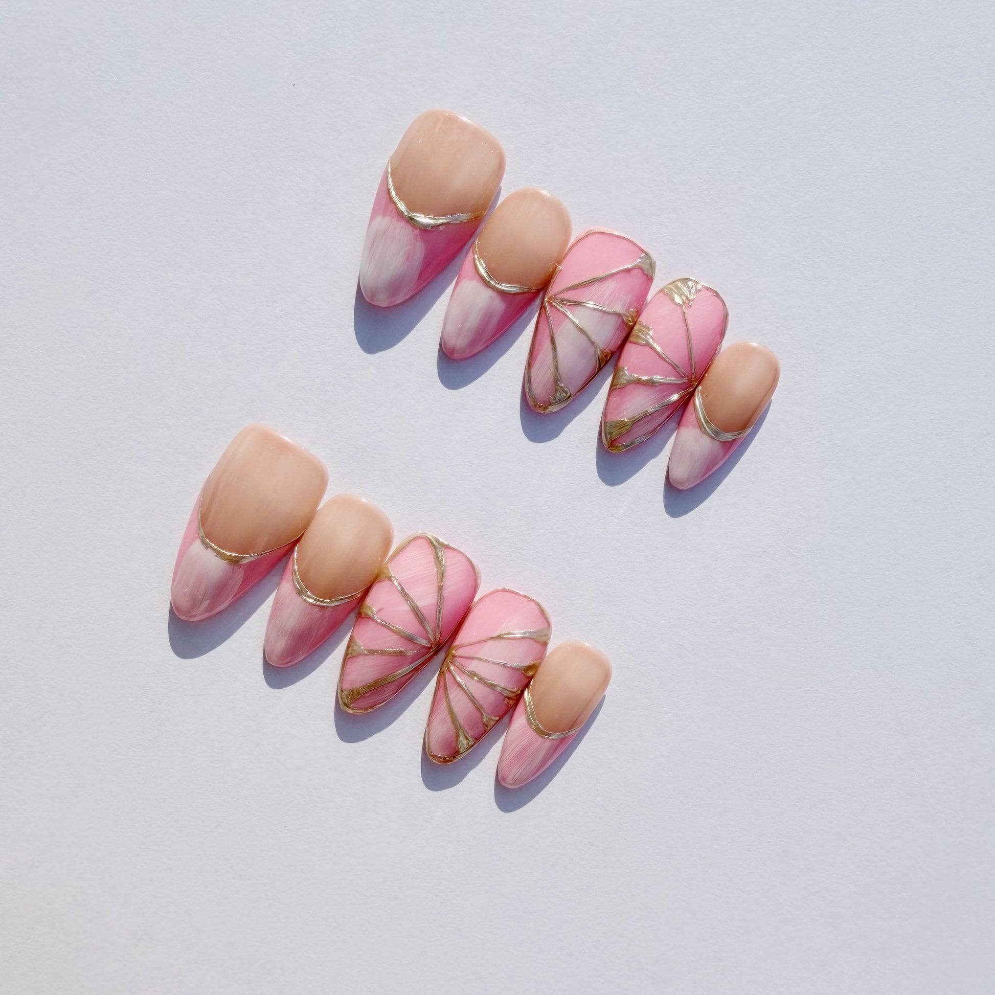 Luxury Press-On Nails | Pink & Nude French Manicure with Gold Foil Butterfly | Reusable, Almond Shape