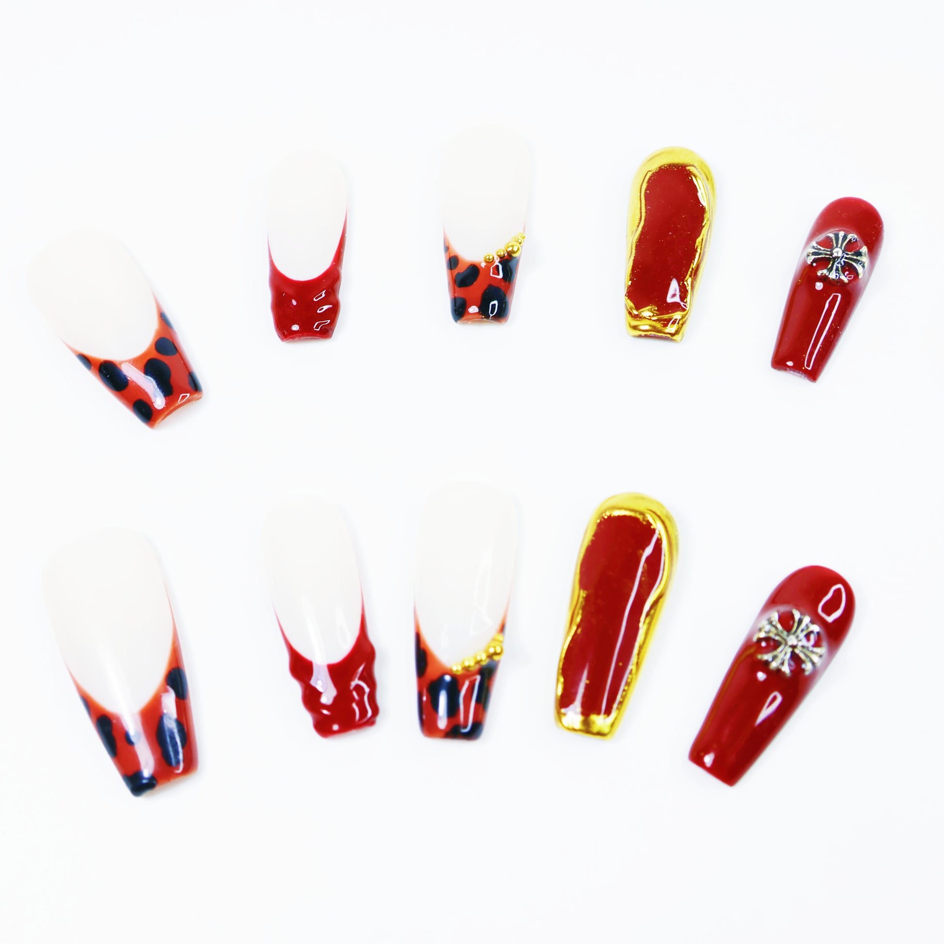Red & Gold Leopard French Press-On Nails – Luxury Animal Print Nail Set with 3D Charms