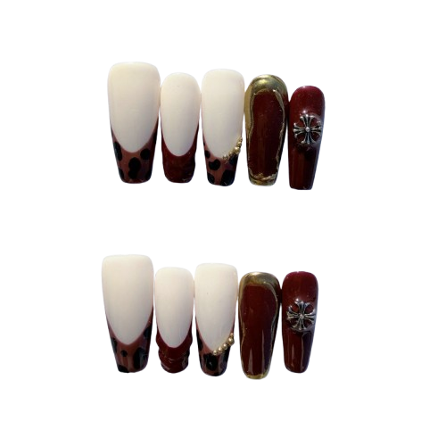 This premium set combines modern French tips with bold leopard accents and metallic gold framing — the perfect balance of elegance and edge. Each nail is finished with a glossy, salon-grade topcoat and detailed 3D embellishments for a chic, high-fashion look.